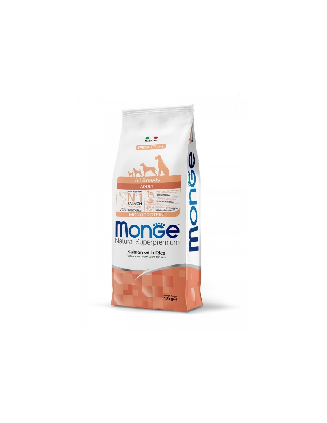 MONGE DOG SALMON&RICE - kompletné krmivo pre dospelé psy s čerstvým lososom a ryžou, obsahuje glukosamín a chondroitín sulfát Zloženie: losos (min. 10% čerstvého mäsa, min. 23% sušeného mäsa), ryža (min 15%), kukurica, kukuričný olej, repné rezne, pivovarské kvasnice, hydrolizovaný živočíšny proteín, kukuričný lepok, lososový olej, fosfor , vitamíny, minerály, cholín chlorid, chondroitín, glukosamín, MSM, DL-Metionín, prírodný gaštanový extrakt, FOS (fruktooligosacharidy), hydrolizované kvasnice (MOS), juka schidigera, spirulina, Vitamín E, Vitamín C, L- Hrubý proteín 25%, Hrubé tuky a oleje 14%, Hrubá vláknina 2,50%, Hrubý popol 6,50%, Vápnik 1,20%, Fosfor 0,90%, Omega 6 mastné kyseliny 4,00%, Omega 3 mastné kyseliny 0,30% Doplnkové látky/kg: Vitamín A (Retinyl acetát) 24.000 IU, Vitamín D3 (Cholekalciferol) 1.700 IU, Vitamín E (Tokoferol) 190 mg, Vitamín B (Thiamín nitrád) 12 mg, Vitamín B2 (Riboflavín) 15 mg, Vitamín B6 (Pyridoxín Hydrochlorid) 7 mg, Vitamín B12 150 mg, Vitamín H (Biotín) 20 g, Vitamín 30 mg, Vitamín C 200 mg, Kyselina pantoténová 18 mg, Kyselina listová 1,7 mg, Cholín Chlorid 2.500 mg, Inositol 3,6 mg, Síran manganatý Monohydrát 10 mg (Mangán 32 mg), Oxid Zinečnatý 1 ), Síran meďnatý Pentahydrát 52 mg (Meď 13 mg), Síran Železnatý Monohydrát 360 mg (Železo 110 mg), Seleničitan sodný 0,50 mg (Selén 0,20 mg), Jodid vápenatý bezvodý 2,70 mg (Jod mg), Aminokyseliny/kg: L-Karnitín 50%: 100 mg, MSM (Methilsulfonilmetán) 400 mg, Glukosamín 400g, Chondroitín sulfát 260mg, Antioxidanty: extrakt z rozmarínu