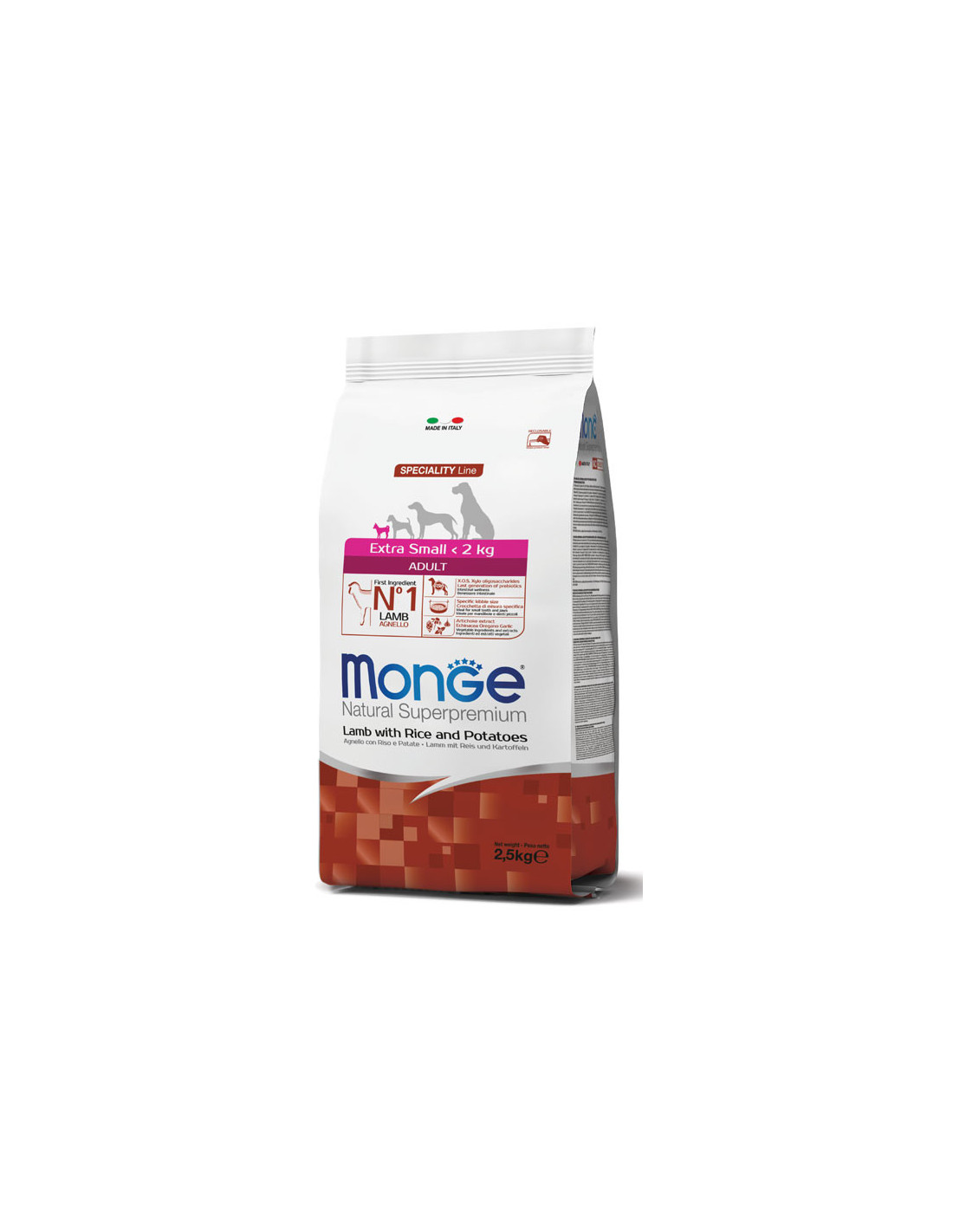 Špeciálne vyvinuté pre zdravie vášho psa výskumom špičkových živín spoločnosťou Made in Italy. Prvou zložkou je jahňacie mäso a zloženie sa vyznačuje stráviteľnosťou a chutnosťou vďaka pridaniu čerstvého mäsa. Receptúra je tiež vylepšená o XOS (xylo-oligosacharidy) novej generácie, čo sú prebiotiká na podporu črevného zdravia, a o rastlinné zložky a extrakty, ako je koreň echinacey, oregano, cesnak a extrakt z artičokov. Okrem toho má formulácia optimálny pomer omega-6 a omega-3, ktorý pomáha udržiavať lesklú srsť vďaka prítomnosti lososového oleja. Veľkosť granúl bola špeciálne vyvinutá pre malé zuby a čeľuste. Bez pridaných farbív a umelých konzervantov. Zloženie: Jahňacie mäso (sušené 30%, čerstvé mäso 10%), ryža (15%), kukurica, živočíšny tuk (kurací olej purifikovaný na 99,5%), sušená repná dužina, zemiakový proteín (4%), pivovarské kvasnice, kukuričný lepok, hydrolyzované živočíšne bielkoviny (pečeň), ryby (sušený losos), rybí olej (lososový olej 1%), minerály, výrobky z kvasníc (mannano-oligosacharidy MOS 1%), xylo-oligosacharidy (XOS 0,3%), juka schidigera (0,3%), múčka z rias (spirulina – Arthrospira platensis 0,3%), produkty zo spracovania rastlín (koreň Echinacea purpurea 0,2%, Origanum Vulgare 0,1%), sušený cesnak (0,2%), glukozamín, chondroitín sulfát. Hrubý proteín: 26%, hrubá vláknina: 2,5%, hrubý tuk: 15%, hrubý popol: 6%, vápnik: 1,2%, fosfor: 0,8%, n-3 mastné kyseliny: 0,5%, n-6 mastné kyseliny: 4,4%, omega-6/omega-3=8, metabolizovaná energia: 4,130 kcal/kg. Výživové doplnkové látky / kg: vitamín A (retinylacetát) 30 700 IU, vitamín D3 1 610 IU, vitamín E (all-racalpha-tokoferylacetát) 72 mg, selén (seleničitan sodný 0,4 mg) 0,2 mg, mangán (monohydrát síranu manganatého 90 mg) 29 mg, zinok (oxid zinočnatý 170 mg) 136 mg, meď (síran meďnatý pentahydrát 46 mg) 11,7 mg, železo (síran železitý monohydrát 296 mg) 97,5 mg, jód (bezvodý jodičnan vápenatý 2,4 mg) 1,5 mg, L-karnitín: 135 mg, DL-metionín (technicky čistý): 1 400 mg. TECHNOLOGICKÉ PRÍSADY: Antioxidanty: Tokoferolové extrakty z rastlinných olejov.
